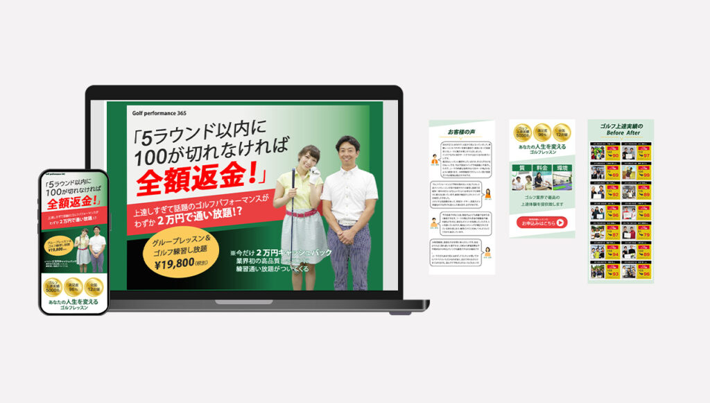 制作コンセプト:第一印象で「ゴルフ関連の広告」と分かるよう、業界カラーであるグリーンを基調にデザインしました。